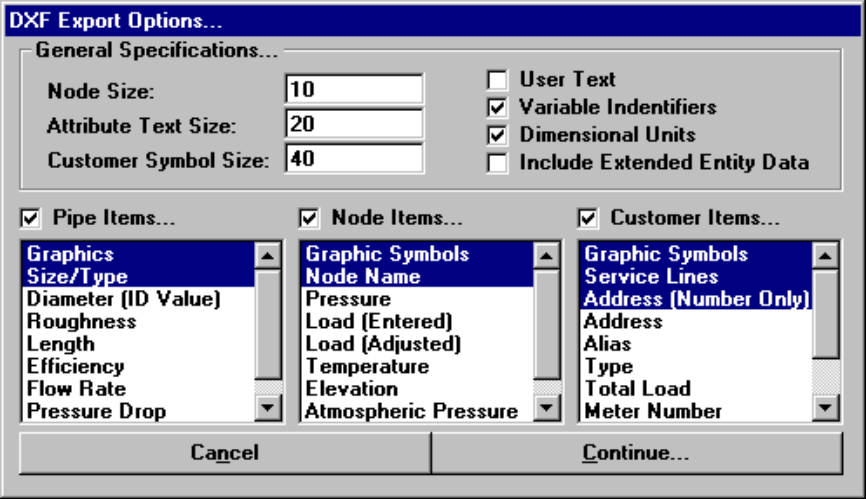 The Graphical Data Interface (GDI) provides map style graphical access to the model data. The GDI allows the inclusion of Bitmap (BMP) or Drawing Interchange File (DXF), or Shape (SHP file images as a reference background. Using the GDI, the User can draw the model schematic using point-and-click mouse entry, coordinate value entry, or relative distance and angle entry. The GDI provides pop-up data screens for editing and viewing of the various pipe, node and customer data and analysis results.