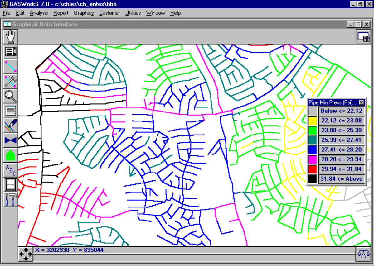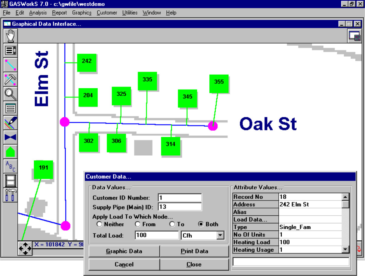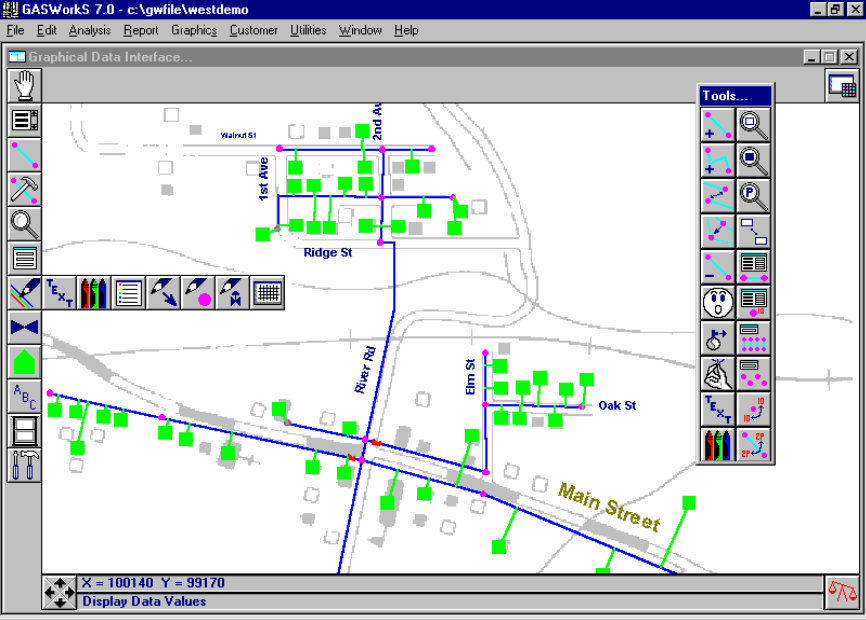 The GDI includes a wide variety of tools for modifying the pipe, node, and customer model features including routines for adding, deleting and moving features. Various zoom commands including the ability to zoom in by a User specified window, zoom by a User specified scale, and zoom to a previous view allow the User to easily move around the model image. A robust set of color coding and tracing routines enhance the User's ability to graphically review the analysis results and the system's performance. The trace routines are complimented by the inclusion of what we refer to as “valve nodes”. The valve node feature was developed to assist in the design and layout of emergency isolation areas. A complete set of annotation routines allows the User to include notes and references in the model graphics.