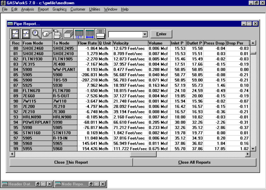 The pipe report provides a comprehensive collection of information including reporting of both size/type and internal diameter values, reporting of pipe inlet, outlet and average pressures, flow rates, velocities and volumes, and simultaneous reporting of linear and pressure drop per User specified length. Selection sets may be created from within the standard reports, allowing unique reporting of User specified data groups. Hierarchical queries allow the creation of sub-sets from a previously created selection set. Reports may be printed onto any Windows supported device, allowing the selection of paper orientation, and font size and type.